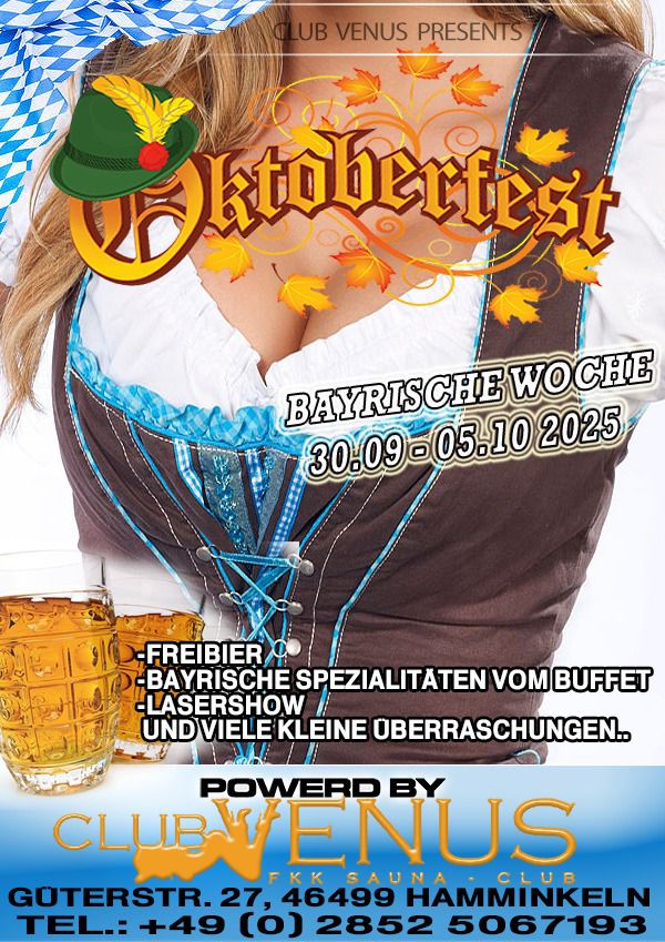 Erlebe das Oktoberfest-Feeling 🎉 Vom 30.09. bis 05.10.2025 verwöhnen wir dich in der Bayerischen Woche im Saunaclub Venus Hamminkeln mit authentischen Schmankerln und einem ganz besonderen Ambiente.